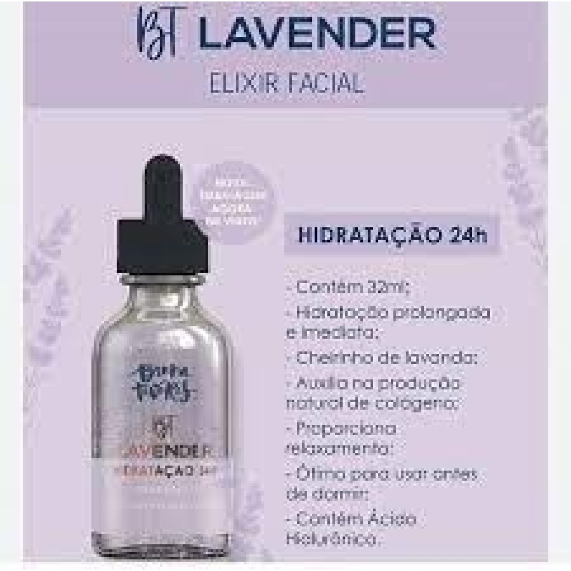 O BT LAVENDER É UM ELIXIR DE HIDRATAÇÃO E PROTEÇÃO DA PELE. SUA FÓRMULA CONTÉM UM ATIVO NATURAL,DERIVADO DAS RAÍZES DA SÁLVIA VERMELHA , QUE AGE NOS TRÊS COMPONENTES BIOLÓGICOS DA PELE . TAMBÉM POSSUI ATIVOS QUE RESTAURAM A BARREIRA CUTÂNEA , HIDRATANDO E ATUANDO NA PRODUÇÃO NATURAL DE COLÁGENO , ELASTINA E ÁCIDO HIALURÔNICO.