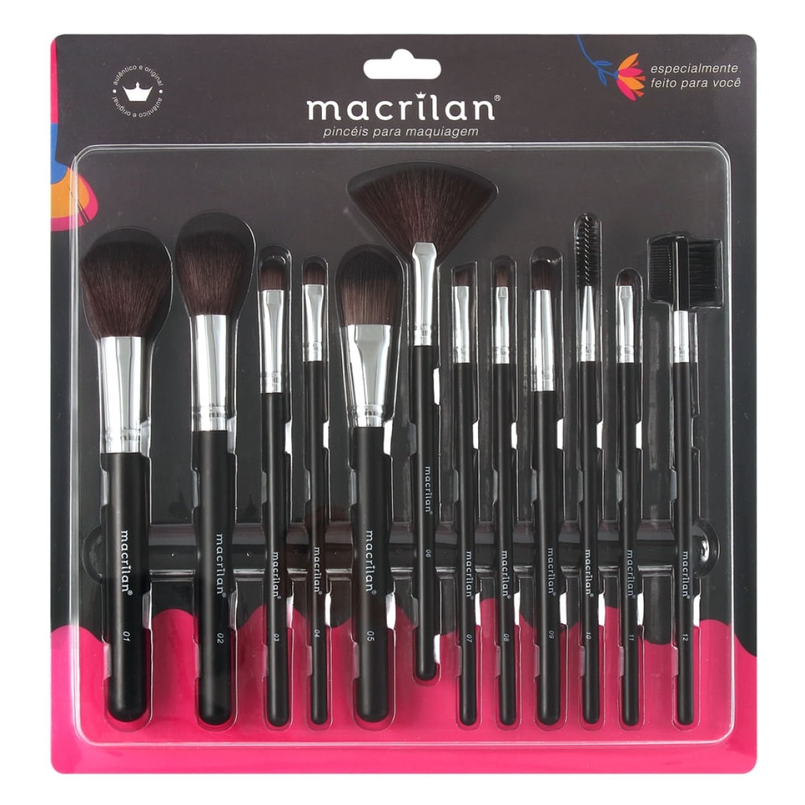 Kit de Pincéis Macrilan KPA-1A! Pincéis com cerdas macias, sintéticas e naturais, para um melhor acabamento. Utilizado em maquiagens profissionais e de dia a dia. O Kit contém 12 pincéis, sendo eles: - 1 Pincel para Pó: para aplicar pó facial, pó solto ou iluminador por toda a face, pescoço e colo. - 1 Pincel de Blush: para aplicar blush nas maças do rosto. - 1 Pincel para Corretivo: para aplicar corretivo ao redor dos olhos, olheiras e pequenas imperfeições na face. - 1 Pincel para Base: para aplicar base, BB Cream e CC Cream por toda a face. - 1 Pincel de Sombra: para aplicar sombra por toda a região das pálpebras. - 1 Pincel Chanfrado para Delinear: para apZlicar delineador em gel na linha dos cílios superiores e inferiores. Utilize também para corrigir e delinear as sobrancelhas. - 1 Pincel Leque: para retirar excessos de maquiagem e aplicar iluminador. - 1 Pincel para Esfumar: para aplicar sombra na região do côncavo, cantos e esfumar. - 1 Pincel Pente e Escova: para remover o excesso de máscara e pentear as sobrancelhas. - 1 Pincel para Cílios e Sobrancelhas: para aplicar máscara nos cílios e também para pentear as sobrancelhas. - 1 Pincel para Batom: para aplicar batom e brilho labial. - 1 Pincel para Detalhes: para aplicar sombra em pequenos detalhes, como canto inferior dos olhos, rente aos cílios superior ou inferiores.
